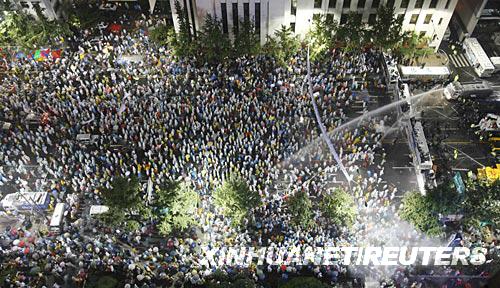 6月28日,在韓國首都首爾,防暴警察用水槍和消防栓噴水以驅(qū)散抗議隊伍。新華社/路透