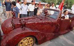 日前,開(kāi)封青年雕刻家朱雪耗時(shí)兩年時(shí)間雕刻完成的“奧運(yùn)和諧號(hào)”藝術(shù)車(chē)在鄭州文廟廣場(chǎng)前展出。這臺(tái)以老爺車(chē)軀干為骨架的藝術(shù)車(chē)使用了1000公斤紅木,雕刻出雙龍、華表、天安門(mén)、奧運(yùn)五環(huán)、中國(guó)印以及福娃等中國(guó)元素和奧運(yùn)符號(hào)。
