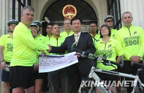 6月30日,在位于英國(guó)倫敦的中國(guó)大使館門前,中國(guó)駐英使館代辦張立榮(前中)與前來為中國(guó)四川地震災(zāi)區(qū)捐款的英國(guó)伯明翰中國(guó)城的片警合影。當(dāng)日,伯明翰中國(guó)城的13名片警騎車180公里來到這里,向張立榮遞交他們?yōu)橹袊?guó)四川地震災(zāi)區(qū)募捐的7559.38英鎊(約合人民幣10.33萬(wàn)元)款項(xiàng)。 |