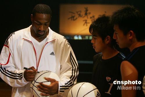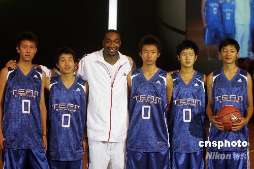 7月3日,NBA球星吉爾伯特·阿里納斯在上海出席阿迪達(dá)斯2008夏季籃球聯(lián)賽全國(guó)總決賽開幕式,一支來自汶川的高中籃球隊(duì)得到了吉爾伯特·阿里納斯的特別“照顧”,傳授球技、合影留念,吉爾伯特·阿里納斯(左三)和這些小球員來了個(gè)“親密接觸”。