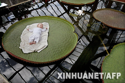 7月6日,在荷蘭烏得勒支的萊登大學植物園,一個熟睡的嬰兒被放在王蓮的葉子上。王蓮葉子的直徑可達1.5米,負重40公斤。 新華社/法新