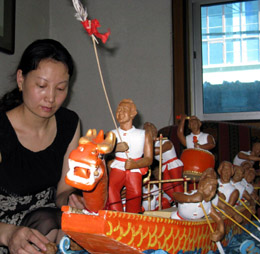 7月7日,陜西安康市新安職業(yè)中學女教師季夏對龍舟泥塑做最后的粘貼、完善。 季夏從小酷愛泥塑藝術(shù),她耗時兩個月構(gòu)思創(chuàng)作出泥塑作品《龍舟競技》,表達對奧運的期盼。