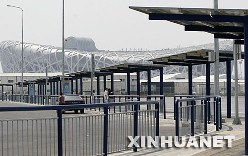 7月13日在北京奧運(yùn)會(huì)主體育場(chǎng)“鳥巢”附近拍攝的新建成的公交車站。