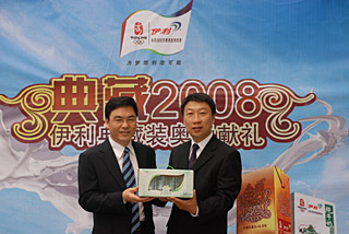 伊利向中國(guó)奧委會(huì)贈(zèng)送伊利奧運(yùn)紀(jì)念裝金典奶。 左:中國(guó)奧委會(huì)市場(chǎng)開發(fā)委員會(huì)主任馬繼龍。 右:伊利集團(tuán)品牌管理部總經(jīng)理靳彪。 | 本報(bào)訊