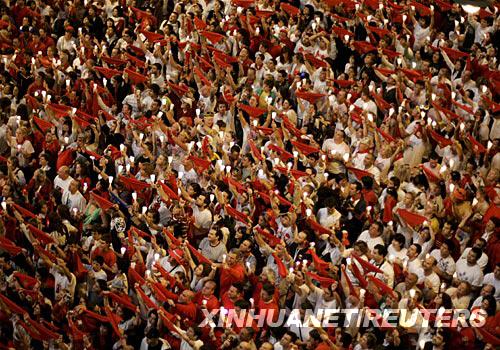 7月15日凌晨,在西班牙北部城市潘普洛納,節(jié)日狂歡者手舉蠟燭和紅絲巾參加圣·費爾明節(jié)的閉幕活動。新華社/路透 | |