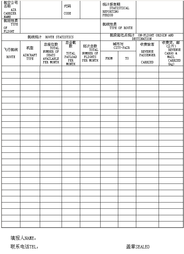 一、填報(bào)說(shuō)明 1.《外國(guó)航空公司運(yùn)輸業(yè)務(wù)量統(tǒng)計(jì)表》是對(duì)在中華人民共和國(guó)境內(nèi)民用航空機(jī)場(chǎng)起降的外國(guó)航空公司航班運(yùn)量進(jìn)行統(tǒng)計(jì)的定期統(tǒng)計(jì)報(bào)表,用以反映國(guó)際航線運(yùn)輸規(guī)模,為國(guó)際航線的運(yùn)輸組織和管理提供依據(jù)。 2.《外國(guó)航空公司運(yùn)輸業(yè)務(wù)量統(tǒng)計(jì)表》分為月報(bào)表和年報(bào)表,要求在中華人民共和國(guó)境內(nèi)民用航空機(jī)場(chǎng)起降的外國(guó)航空公司按本表要求向中國(guó)民用航空局統(tǒng)計(jì)部門填報(bào)航班任一起訖點(diǎn)、經(jīng)停點(diǎn)(技術(shù)經(jīng)停除外)在中華人民共和國(guó)境內(nèi)的航線及城市對(duì)運(yùn)量。 3.《外國(guó)航空公司運(yùn)輸業(yè)務(wù)量統(tǒng)計(jì)表》的月度報(bào)表的報(bào)送時(shí)間不得遲于次月15日;年度報(bào)表的報(bào)送時(shí)間不得遲于次年3月31日。 4.《外國(guó)航空公司運(yùn)輸業(yè)務(wù)量統(tǒng)計(jì)表》的電子模版登載于民航政府網(wǎng)站。外國(guó)航空公司應(yīng)使用該電子模版填報(bào)生成本公司的統(tǒng)計(jì)報(bào)表,并經(jīng)本公司蓋章后,在規(guī)定的時(shí)間內(nèi)將報(bào)表和與之對(duì)應(yīng)的電子文檔(EXCEL文件)分別以信函和電子郵件的形式向中國(guó)民用航空局統(tǒng)計(jì)部門報(bào)送。 二、主要指標(biāo)解釋 1.公司名稱及代碼:填寫航空公司的全稱及代碼,其中,公司代碼采用IATA兩字碼。例如,公司名稱:AIR