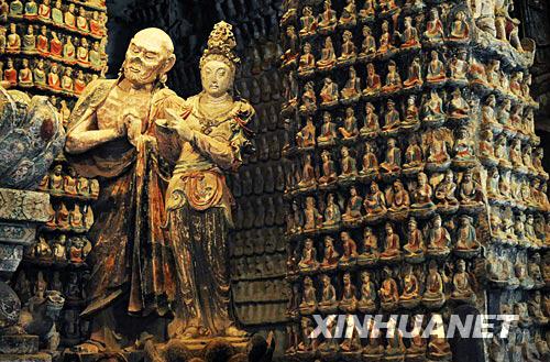 石窟內(nèi)的釋迦摩尼未來世的左侍協(xié)菩薩(前右)和大弟子迦葉(前左)造像(5月12日攝)。