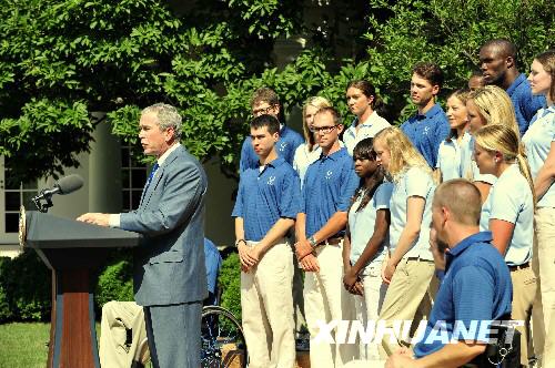 7月21日,美國(guó)總統(tǒng)布什在送行儀式上講話。當(dāng)日,美國(guó)總統(tǒng)布什在白宮玫瑰園為美國(guó)奧運(yùn)代表團(tuán)送行。