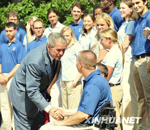 7月21日,美國(guó)總統(tǒng)布什在送行儀式上與代表團(tuán)成員握手。當(dāng)日,美國(guó)總統(tǒng)布什在白宮玫瑰園為美國(guó)奧運(yùn)代表團(tuán)送行。