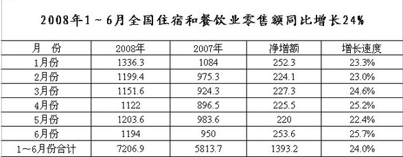今年以來,全國住宿與餐飲業(yè)盡管受南方低溫雨雪冰凍、汶川大地震等嚴(yán)重自然災(zāi)害以及物價上漲、勞動力成本提高的影響,企業(yè)經(jīng)營出現(xiàn)一定程度的波動,但餐飲市場仍呈現(xiàn)出平穩(wěn)增長的良好態(tài)勢,預(yù)計全年餐飲市場仍將繼續(xù)保持快速發(fā)展。 據(jù)有關(guān)數(shù)據(jù)分析,上半年,全國住宿與餐飲市場持續(xù)高增長,零售額達(dá)到7207億元,同比增長24%,比上年同期加快6.2個百分點,占同期社會消費品零售總額的比重為14.1%,拉動社會消費品零售總額增長3.3個百分點。其中,6月份零售額實現(xiàn)1194億元,同比增長25.7%,環(huán)比下降0.8%,比上年同期加快7.2個百分點,比上月加快3.3個百分點。上半年住宿與餐飲業(yè)新設(shè)立外商投資企業(yè)338家,同比下降19.5%;合同外資金額14.1億美元,同比增長3.9%;實際使用外資金額5.1億美元,同比增長9.9%。其中,餐飲業(yè)實際使用外資金額2.2億美元,同比增長34.8%。 上半年餐飲市場主要特點:一是“農(nóng)家樂”餐飲倍受青睞。首次出現(xiàn)的“五一”、“清明”兩個小長假,帶動“農(nóng)家樂”休閑餐飲大幅增長,據(jù)監(jiān)測,農(nóng)家樂餐飲消費同比增長達(dá)到30%。二是婚宴現(xiàn)象突出。據(jù)監(jiān)測,今年春節(jié)、“五一”等假期,一些大中城市婚宴消費增幅達(dá)到30%以上。 根據(jù)餐飲市場運行規(guī)律,預(yù)測下半年餐飲市場快速增長的勢頭不會改變,特別是在第三季度,隨著北京奧運會的舉辦,全國住宿和餐飲消費需求有望明顯增加。預(yù)計第三季度住宿與餐飲業(yè)零售額將達(dá)到3800億元,同比增長24.7%;全年住宿與餐飲業(yè)零售額將達(dá)到15380億元,同比增長24.5%;全國人均餐飲消費支出將達(dá)到1158元,同比增長23.9%。