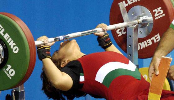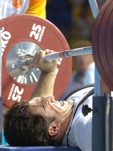 2004年9月25日,伊朗選手雷扎在比賽中力舉杠鈴。當(dāng)日,在雅典尼凱亞舉重館進(jìn)行的第十二屆殘奧會(huì)舉重比賽中,雷扎以195公斤的成績(jī)獲利男子75公斤級(jí)銅牌。