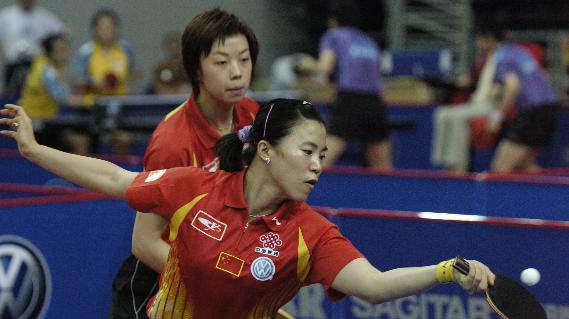 2006年6月16日,中國(guó)選手王楠(前)/張怡寧在女子雙打首輪比賽中以4比1戰(zhàn)勝韓國(guó)選手李恩實(shí)/文炫晶。當(dāng)日,2006年中國(guó)乒乓球公開(kāi)賽在江蘇昆山繼續(xù)進(jìn)行。新華社發(fā)