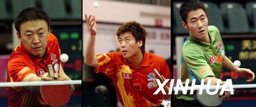 2007年3月25日,中國(guó)乒乓球男隊(duì)“直通薩格勒布”世乒賽選拔賽第二階段的比賽在遼寧錦州結(jié)束。首批6名獲得參賽資格的選手分別是馬琳(左)、郝帥(中)、王勵(lì)勤(右)、馬龍、王皓和張超。新華社發(fā)