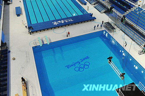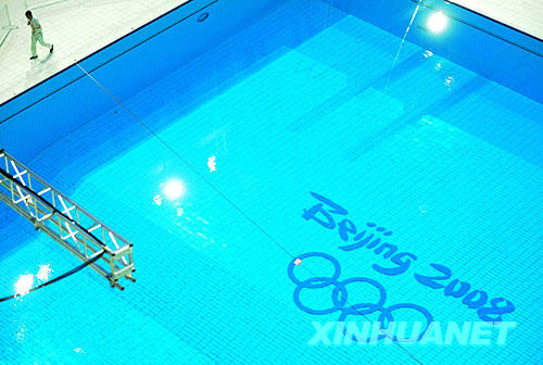 7月24日,工程人員在奧運(yùn)場(chǎng)館“水立方”跳水池中擺放奧運(yùn)標(biāo)志。當(dāng)日,“水立方”跳水池?cái)[放了“Beijing