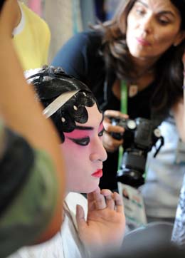 7月26日,記者拍攝中國國家京劇院演員后臺化妝。當日,部分境內外奧運記者采訪了中國國家京劇院,直接感受中國傳統(tǒng)文化。