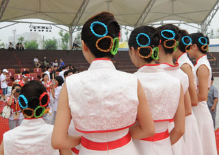 這是7月27日在北京奧運會奧運村開村儀式上拍攝的禮儀小姐的五環(huán)頭飾。當日,2008年北京奧運會奧運村正式開村。