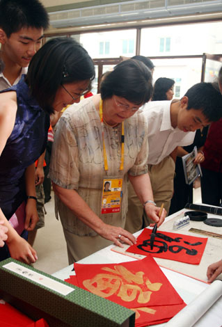 8月7日,國(guó)際奧委會(huì)主席羅格的夫人安妮·羅格女士(中)在北京四中參觀時(shí)親筆寫(xiě)下“!弊。