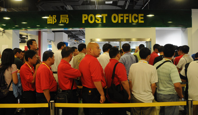 8月8日8時(shí)許,等待購(gòu)買北京奧運(yùn)會(huì)首日封的人們?cè)诒本⿰W運(yùn)會(huì)主新聞中心(MPC)的郵局前排起長(zhǎng)隊(duì)。此刻距北京奧運(yùn)會(huì)開幕還有12個(gè)小時(shí)。