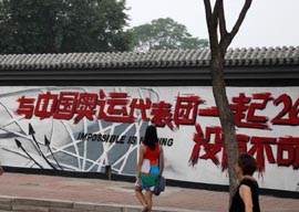 8月7日,人們從北京宣武區(qū)一處“北京奧運(yùn)墻”前經(jīng)過(guò)。該墻長(zhǎng)約300米,畫(huà)著有關(guān)奧運(yùn)內(nèi)容的圖畫(huà),寫(xiě)有祝福北京奧運(yùn)會(huì)的文字。