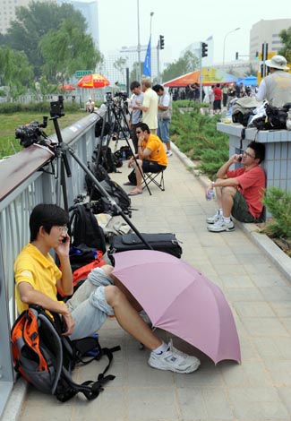 8月8日,眾多攝影記者提前在國家體育場——“鳥巢”南側(cè)架好攝影器材,為晚上的開幕式做準(zhǔn)備。此刻距北京奧運會開幕還有不到6個小時。