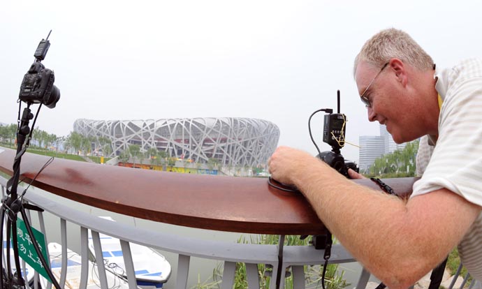 8月8日13時許,一名攝影師在國家體育場——“鳥巢”邊架起相機等待拍攝開幕式上燃放的煙花。此刻距北京奧運會開幕還有不到7個小時。
