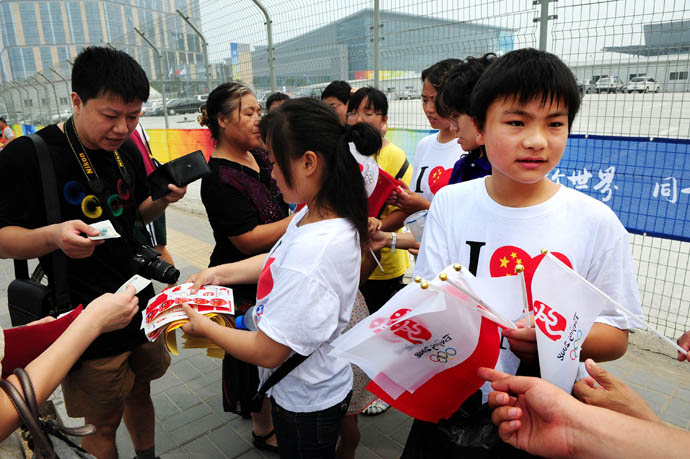 8月8日,人們?cè)谔暨x旗幟。奧林匹克中心區(qū)附近張燈結(jié)彩、彩旗飄揚(yáng),來(lái)自海內(nèi)外的八方賓客歡聚一堂、喜迎奧運(yùn)。此刻距北京奧運(yùn)會(huì)開(kāi)幕還有不到6個(gè)小時(shí)。