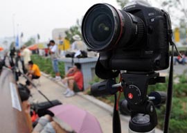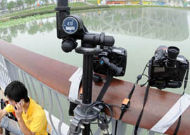 8月8日,眾多攝影記者提前在國家體育場——“鳥巢”南側(cè)架好攝影器材,為晚上的開幕式做準(zhǔn)備。此刻距北京奧運(yùn)會開幕還有不到6個(gè)小時(shí)。