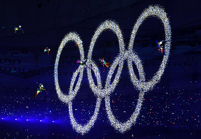8月8日晚8時,第29屆夏季奧林匹克運(yùn)動會在國家體育場——“鳥巢”隆重開幕。這是開幕式上閃閃發(fā)光的夢幻五環(huán)出現(xiàn)在“鳥巢”。