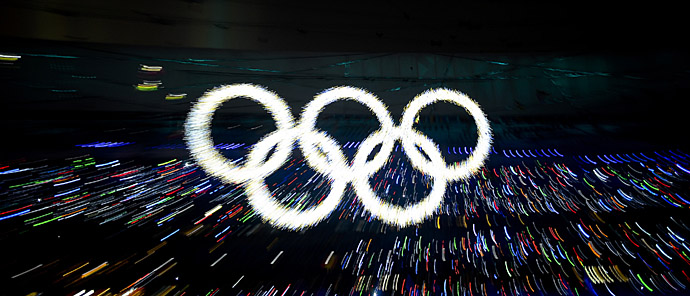 8月8日晚8時(shí),第29屆夏季奧林匹克運(yùn)動(dòng)會(huì)在國(guó)家體育場(chǎng)——“鳥巢”隆重開幕。這是開幕式上閃閃發(fā)光的夢(mèng)幻“五環(huán)”。