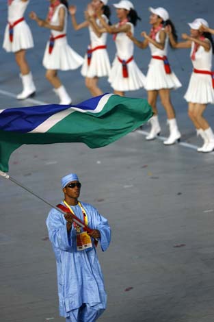 8月8日晚8時,第29屆夏季奧林匹克運動會在國家體育場——“鳥巢”隆重開幕。這是岡比亞代表團在開幕式上入場。