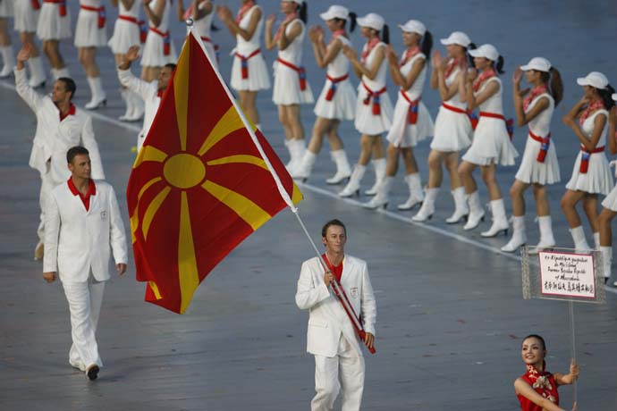 8月8日晚8時,第29屆夏季奧林匹克運動會在國家體育場——“鳥巢”隆重開幕。這是馬其頓代表團在開幕式上入場。