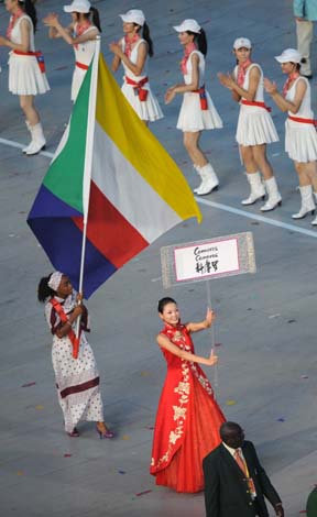 8月8日晚8時(shí),第29屆夏季奧林匹克運(yùn)動(dòng)會(huì)在國家體育場(chǎng)——“鳥巢”隆重開幕。這是科摩羅代表團(tuán)在開幕式上入場(chǎng)。