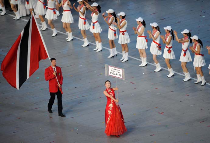 8月8日晚8時(shí),第29屆夏季奧林匹克運(yùn)動(dòng)會(huì)在國(guó)家體育場(chǎng)——“鳥(niǎo)巢”隆重開(kāi)幕。這是特立尼達(dá)和多巴哥代表團(tuán)在開(kāi)幕式上入場(chǎng)。