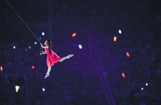 在北京奧運會的開幕式上,一個小女孩兒的出現(xiàn)讓整場演出增添了童趣和浪漫。她就是那個放著風(fēng)箏從“星星鳥巢”上空緩緩飛過的小姑娘朱巧妍。 即將在這個月過9歲生日的小巧妍在雜技界也算是一員“老將”了,來自安徽淮南的小女孩兒5歲便來到沈陽軍區(qū)雜技團學(xué)習(xí)。正是這四年的學(xué)習(xí)生涯為她在“鳥巢”上空自然、淡定的表演奠定了基礎(chǔ)。 其實小巧妍第一次被吊到半空的時候也害怕,那是因為在演出中,她手中的“風(fēng)箏”和她自己是分別被固定在兩個不同的點上的,有的時候兩個“點”走起來不同步,她幼小的身體就會被慣性拽得搖搖晃晃,雖然保護措施非常嚴(yán)密,不會出現(xiàn)危險,但在空中晃來晃去,別說是一個小女孩兒,就是一個大人也受不了。 小巧妍非?斓鼐瓦m應(yīng)了這種高空表演,再第一次被吊到半空,稍微調(diào)整了心情之后,小巧妍居然還調(diào)皮地翻起了跟頭,這可讓創(chuàng)意團隊的叔叔阿姨們跌破了眼鏡,這個角色非她莫屬啊。第一次訓(xùn)練,短短10分鐘,小巧妍征服了所有人,完成了一個成年人或許苦練很長時間才能完成的任務(wù)。 在張藝謀的設(shè)想中,這個小女孩兒的出場一定要親切、自然、生活化,不能有表演的痕跡,小巧妍在叔叔阿姨們耐心地輔導(dǎo)下,終于放下了心理包袱,將這段演出完全當(dāng)成了一次游戲,正是這樣,這場演出才達到了預(yù)期的效果。 小巧妍很樂觀,雖然皮膚被曬得黑黑的,但她在排練期間從來不說苦,不說累,在排練場,小巧妍也給其他演員帶來了歡樂,每次她回到地面,總會有其他的叔叔阿姨過來跟她一起玩兒,跟她合影。為了保護小巧妍稚嫩的身體,開幕式空中特技表演總設(shè)計程小東親自出馬,為小巧妍量身設(shè)計了一套舒適、貼身的防護裝備,這樣,鋼絲就不會勒傷這位大家心目中的小天使。 小巧妍也許是唯一一個能從空中“星星鳥巢”的演員了,她告訴我們,地上的“鳥巢”很美。