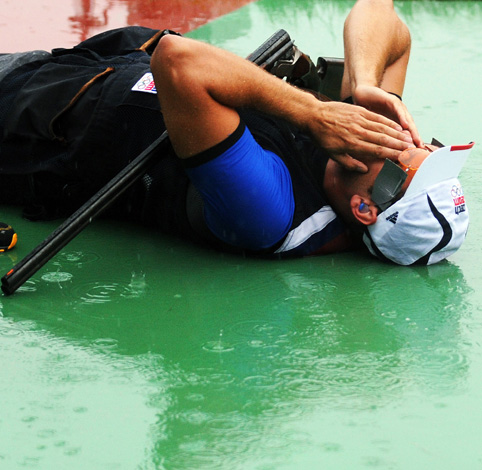 8月10日,捷克選手科斯特萊茨基奪冠后,躺在雨中慶祝勝利。當(dāng)日,在北京射擊場舉行的北京奧運(yùn)會射擊男子飛碟多向決賽中,科斯特萊茨基奪冠。