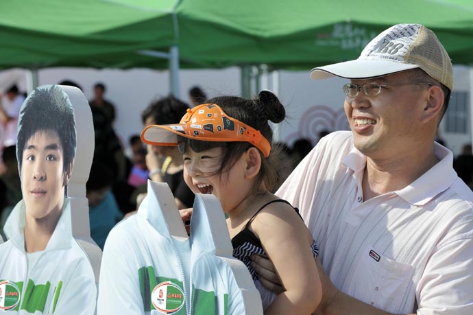 8月11日,一位小朋友在家長的幫助下與“運動員”合影。