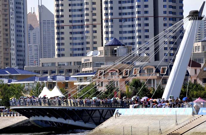 8月11日,眾多觀眾在廊橋上觀看帆船比賽。