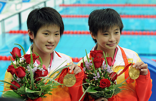 除了“完美”,你幾乎找不到更好的詞匯,來描繪12日王鑫和陳若琳的表現(xiàn)。 16歲的青春年華,“水立方”的夢幻空間,第一枚奧運金牌的滋味,以及毫無瑕疵的奪金過程,這一切,都太過美妙。 在“水立方”,開闊的空間,供她倆似小燕自由翻飛,碧藍的水池,供她倆如小鴨優(yōu)雅嬉戲。1萬多名觀眾匯聚起來的掌聲和吶喊,全部獻給這兩位10米高臺上的天使。 就在前一天,王鑫剛剛度過16周歲的生日。比賽結(jié)束后,王鑫的小臉燦若桃花,她說:“這枚金牌,是我16年來得到的最珍貴的生日禮物。獲得奧運會金牌,也當然是我一直以來的愿望! 比王鑫小4個月零一天的陳若琳則說:“其實我們和國外選手的實力都差不多,主要要靠平時苦練! 讓我們重溫這對中國“小丫”完美摘金的過程: 北京奧運會女子雙人10米跳臺決賽于14時30分開始。在8對參賽選手中,王鑫/陳若琳第五個出場。她倆的動作難度系數(shù)為13.6,僅列第四,但了解她們的人都知道,這并不是問題?∏蝺(yōu)美的空中姿態(tài),形同一人的默契配合,微弱細小的入水水花,才是她倆的制勝武器。 第一跳,55.80分,名列第一,其中一名同步分裁判給出了10分; 第二跳,55.20分,再列第一,其中一名技術(shù)分裁判給出了10分; 接下來的三個動作,同樣無懈可擊,同樣得到最高分。最終,王鑫/陳若琳以363.54分的總成績高居榜首,比第二名高出了28.38分。 王鑫/陳若琳獲得的這枚金牌,也延續(xù)了中國跳水“夢之隊”在女雙10米跳臺這個項目上的輝煌。悉尼奧運會上是李娜/桑雪,雅典奧運會上是李婷/勞麗詩,自雙人跳水項目于2000年進入奧運會以來,中國隊從未讓女雙10米跳臺這枚金牌旁落。 第一次參加奧運會,為何能在比賽中表現(xiàn)得如此冷靜呢?王鑫說:“訓(xùn)練時教練讓我們放松,其實沒必要把奧運會看得太過重要,我們需要做的就是放平心態(tài),放松地去跳! 王鑫告訴記者,11日是生日,自己并沒搞什么慶;顒樱矝]許什么愿,但還是收到了隊友們送的很多禮物,有衣服、項鏈等等。記者問:“陳若琳送了什么?”王鑫答:“她送給我友誼! 對于奪冠的秘訣,有些靦腆的陳若琳說:“我們并沒有什么特別的心理訓(xùn)練,只是把平常的訓(xùn)練當作比賽來跳! 不能不說的是,像任何一位奧運冠軍一樣,王鑫、陳若琳同樣走過了艱辛的人生道路。王鑫是湖北人,最初練體操,8歲背井離鄉(xiāng)進入清華跳水隊,此后又輾轉(zhuǎn)來到天津跳水隊進行訓(xùn)練。來自江蘇南通的陳若琳一直是中國跳水隊中訓(xùn)練最刻苦的隊員之一,身體的發(fā)育曾讓她頗為苦惱,為了減體重,她不得不強力克服小姑娘嘴饞的天性,“餓了,就睡覺”。 過人的天資加上百倍的付出,讓王鑫和陳若琳自2007年配對以來,連續(xù)獲得2007年世界跳水系列賽全部3站、2008年世界杯賽以及多次國際泳聯(lián)大獎賽的冠軍,成為公認的女雙跳臺世界第一組合。 20日,王鑫、陳若琳將以對手的身份參加單人跳臺項目的角逐。王鑫說:“我們會互相幫助,希望我倆都取得好成績。”