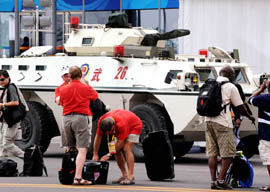 8月12日,,一輛安保裝甲運(yùn)兵車停在北京奧運(yùn)會(huì)新聞中心(MPC)安檢口,成為媒體關(guān)注的焦點(diǎn)。許多記者還饒有興趣地與之合影留念,感受一下這位“裝甲明星”的威風(fēng)。