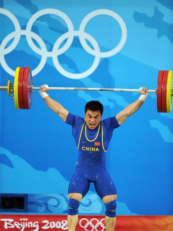 8月12日,中國(guó)運(yùn)動(dòng)員廖輝在比賽中。當(dāng)日,廖輝在北京奧運(yùn)會(huì)舉重男子69公斤級(jí)決賽中以348公斤的總成績(jī)獲得金牌。