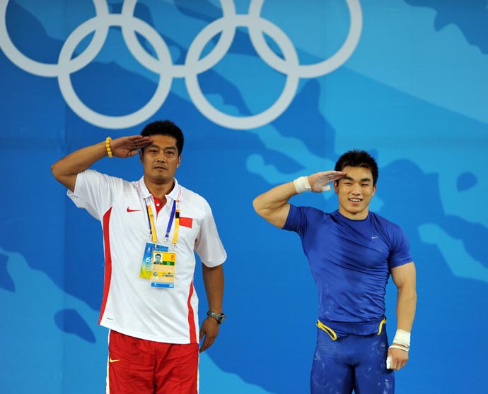 8月12日,中國選手廖輝(右)和教練于杰在奪冠后向觀眾行軍禮。當(dāng)日,廖輝在北京奧運(yùn)會(huì)舉重男子69公斤級(jí)決賽中以348公斤的總成績獲得金牌。