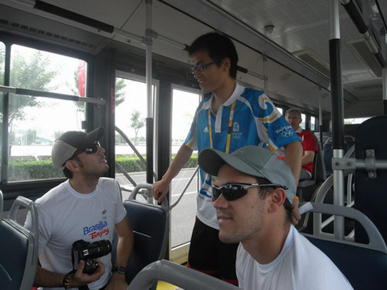“請(qǐng)問車?yán)锟照{(diào)的溫度可以嗎?”問這句話的人是一位在駛往奧運(yùn)村大巴上服務(wù)的志愿者,一句話頓時(shí)讓人感覺到志愿者的服務(wù)熱情。