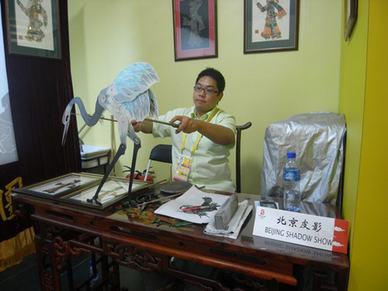 在民族民間手工藝制作展示中心還有皮影戲的演出。北京皮影藝術(shù)劇團(tuán)在此設(shè)了一個(gè)小劇場,每天上午10點(diǎn)、11點(diǎn),下午4點(diǎn)、5點(diǎn)、6點(diǎn),都有演出。“每天一部戲,今天演得是《骨洞魔影》,看到人挺多!