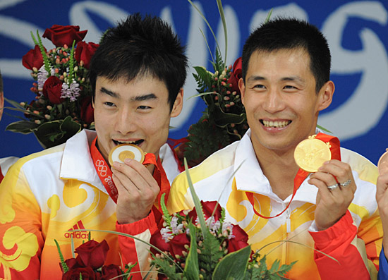 中國(guó)選手秦凱(左)/王峰展示金牌。新華社記者 趙鵬 攝 |