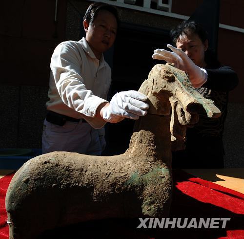 8月13日,甘肅省武威市文物考古研究所工作人員整理出土的陶馬。經(jīng)過搶救性發(fā)掘,甘肅省武威市文物考古研究所工作人員在位于武威市涼州區(qū)的一座漢代墓葬中發(fā)現(xiàn)精美陶器40多件,這批陶器被初步認(rèn)為屬于東漢晚期。