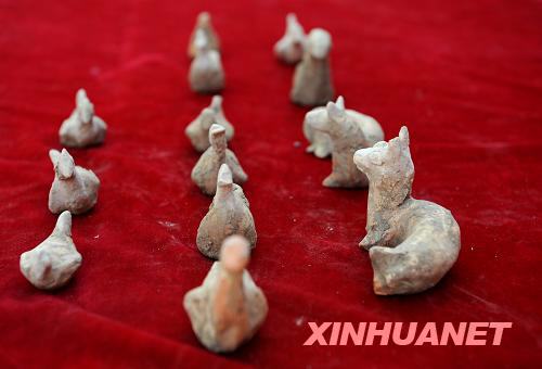 這是出土的陶制樓院內(nèi)的一些陶制小動(dòng)物(8月13日攝)。