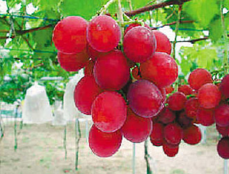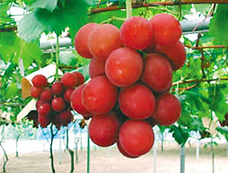 這張日本石川縣政府在8月12日提供的拼版照片展示了石川縣金澤市一個農(nóng)業(yè)試驗基地的新品種優(yōu)質(zhì)葡萄“羅馬紅寶石”。這種優(yōu)質(zhì)葡萄11日在日本市場首次推出,其中重700克、有35粒的一串葡萄以10萬日元(約合910美元)的價格創(chuàng)下日本葡萄拍賣最高紀錄。新華社/法新