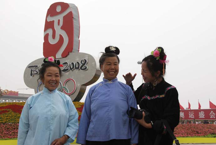 8月13日,3位來自貴州的苗族婦女在北京天安門廣場北京奧運(yùn)花壇旁合影。北京奧運(yùn)會期間,許多少數(shù)民族群眾身著節(jié)日盛裝來到北京觀看比賽,游覽新景點(diǎn)。