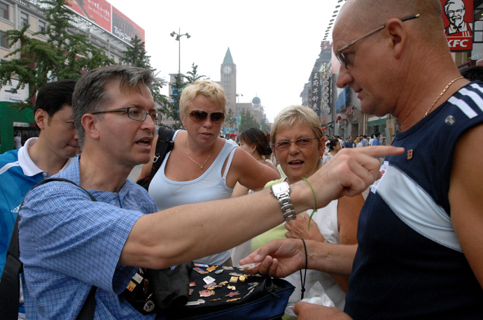 8月13日,來自美國的奧運(yùn)會(huì)紀(jì)念章收藏者拉里·馬洛尼(左一)在北京王府井商業(yè)街與其他國家的游客交換奧運(yùn)會(huì)紀(jì)念章。 據(jù)介紹,拉里多次到奧運(yùn)主辦城市收集奧運(yùn)會(huì)紀(jì)念章,目前已收集了各式奧運(yùn)會(huì)紀(jì)念章5000多枚。北京奧運(yùn)會(huì)賽事期間,建立了四個(gè)官方奧運(yùn)紀(jì)念章交換中心,吸引了眾多中外紀(jì)念章愛好者前來交流。