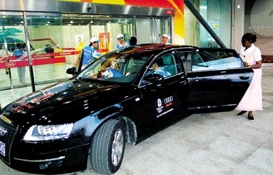 >> 夜幕下,一起大眾汽車將奧運(yùn)官員送抵運(yùn)動(dòng)場